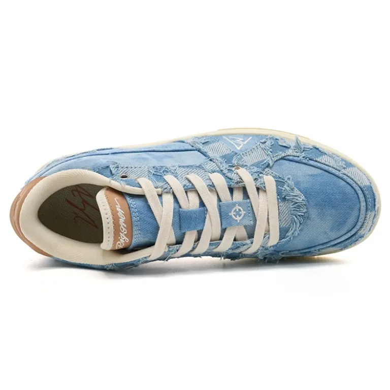 Confectionnée à partir de textiles façon jean bleu délavé, cette sneaker se distingue par son patchwork de matières et ses finitions volontairement brutes. Chaque empiècement apporte du relief et du caractère, donnant à la chaussure une identité unique, vivante, loin des modèles standards et uniformes.
